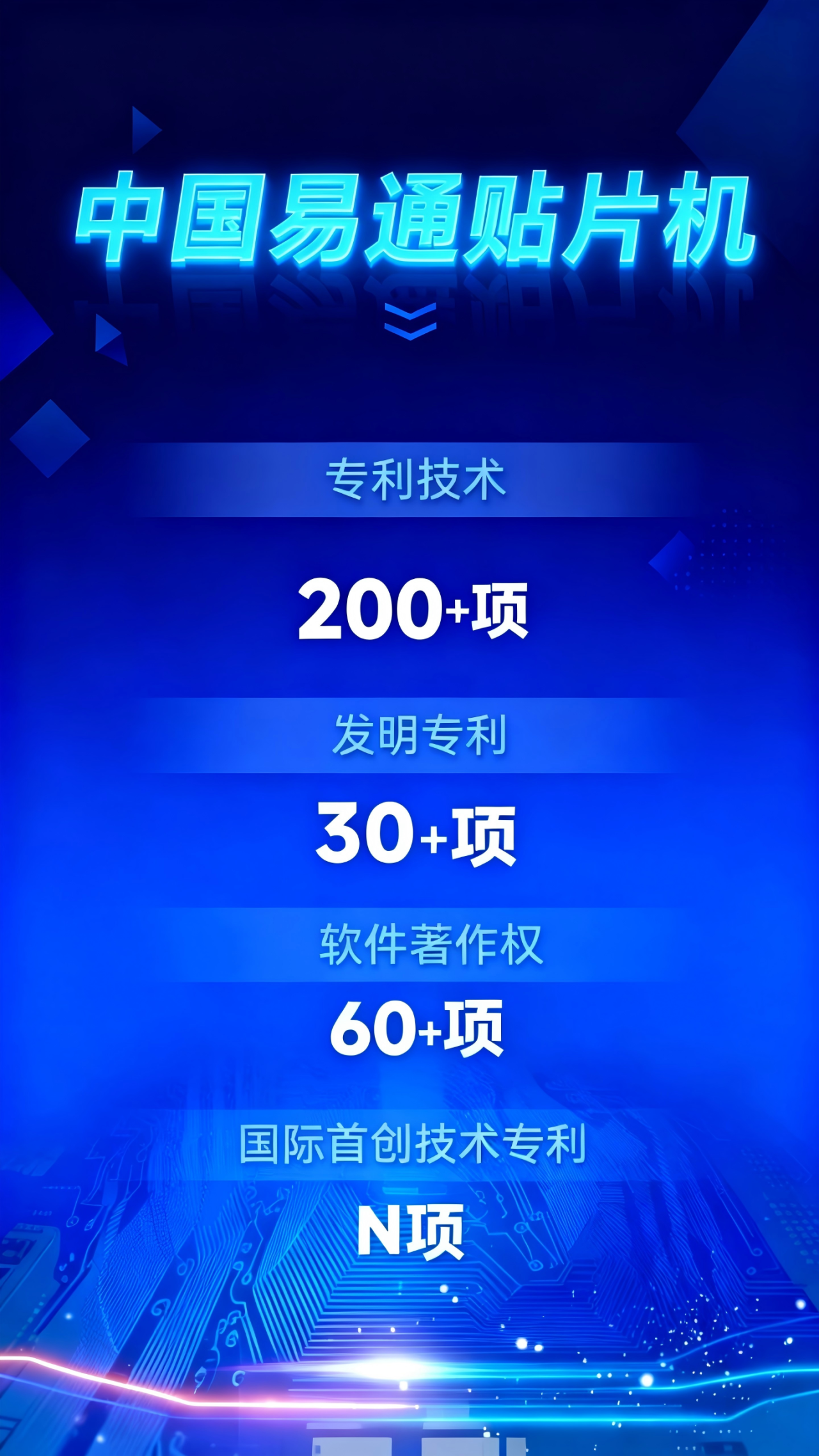 截至2025年,易通贴片机累计掌握200多项专利,其中包括30多项发明专利、60多项软件著作权,以及N项国际首创技术专利,
